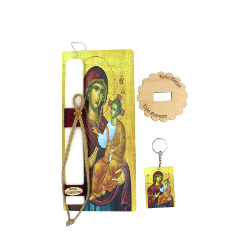 Χειροποίητη Λαμπάδα πλακέ με αρωματικό κερί ''Παναγία'' με πλάτη μπρελόκ και κυπελλάκι - κηροστάτης 437