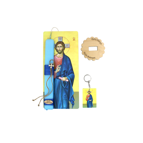 Χειροποίητη Λαμπάδα πλακέ με αρωματικό κερί ''Χριστός'' με πλάτη μπρελόκ και κυπελλάκι - κηροστάτης 4312.12.C